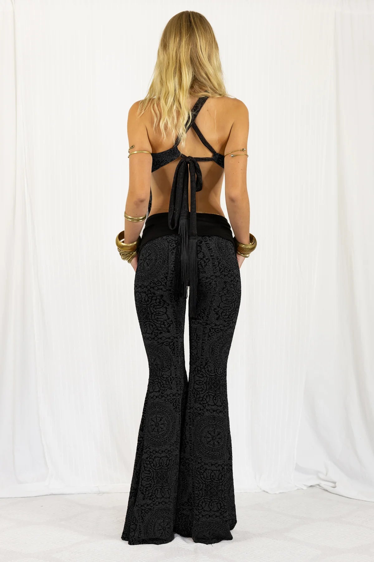Sparkly black on black bellbottoms with an intricate jacquard pattern. The perfect shimmery pant for dancing all day in the sun or all night under the stars. These are ULTRA sparkly!