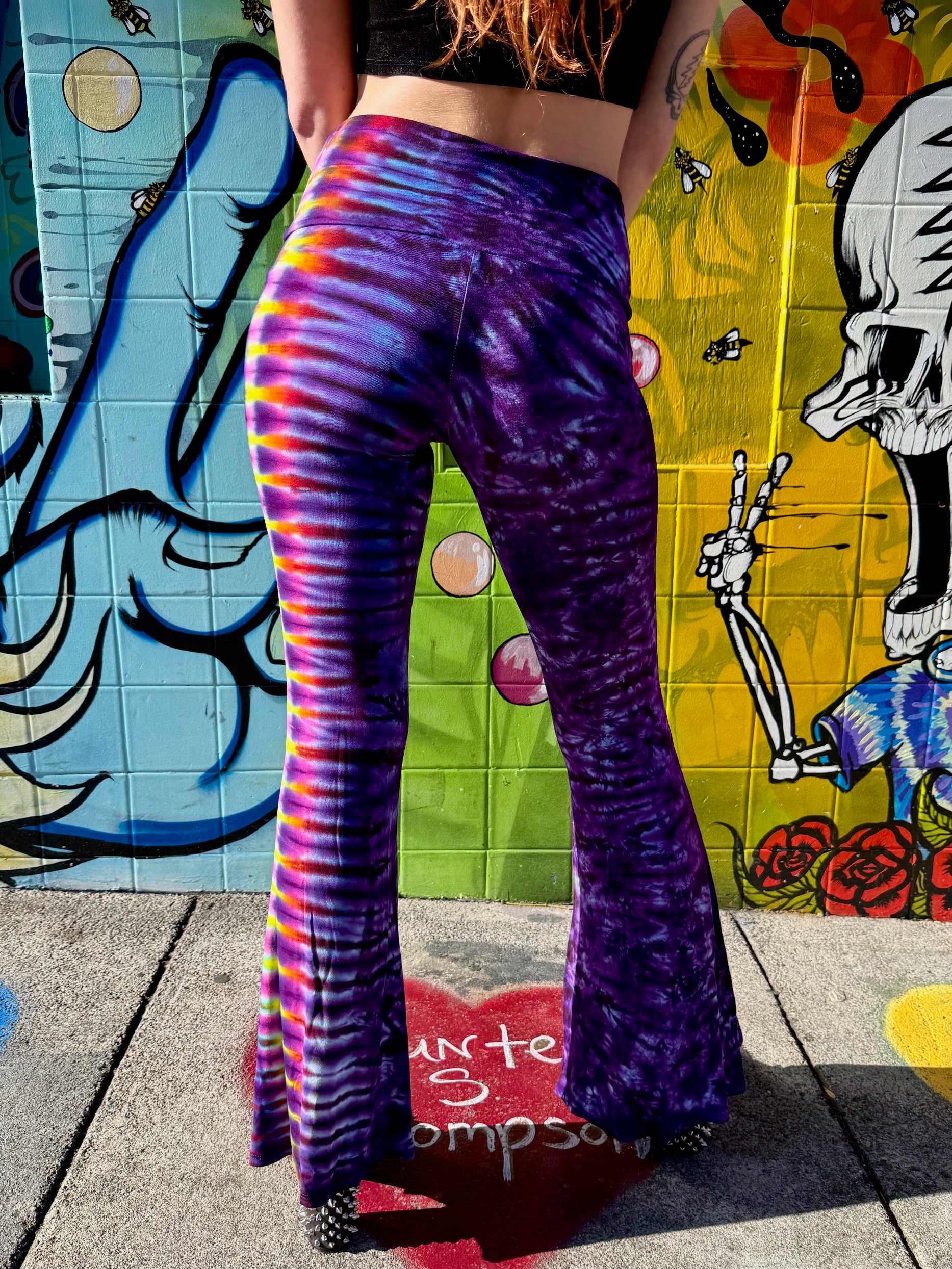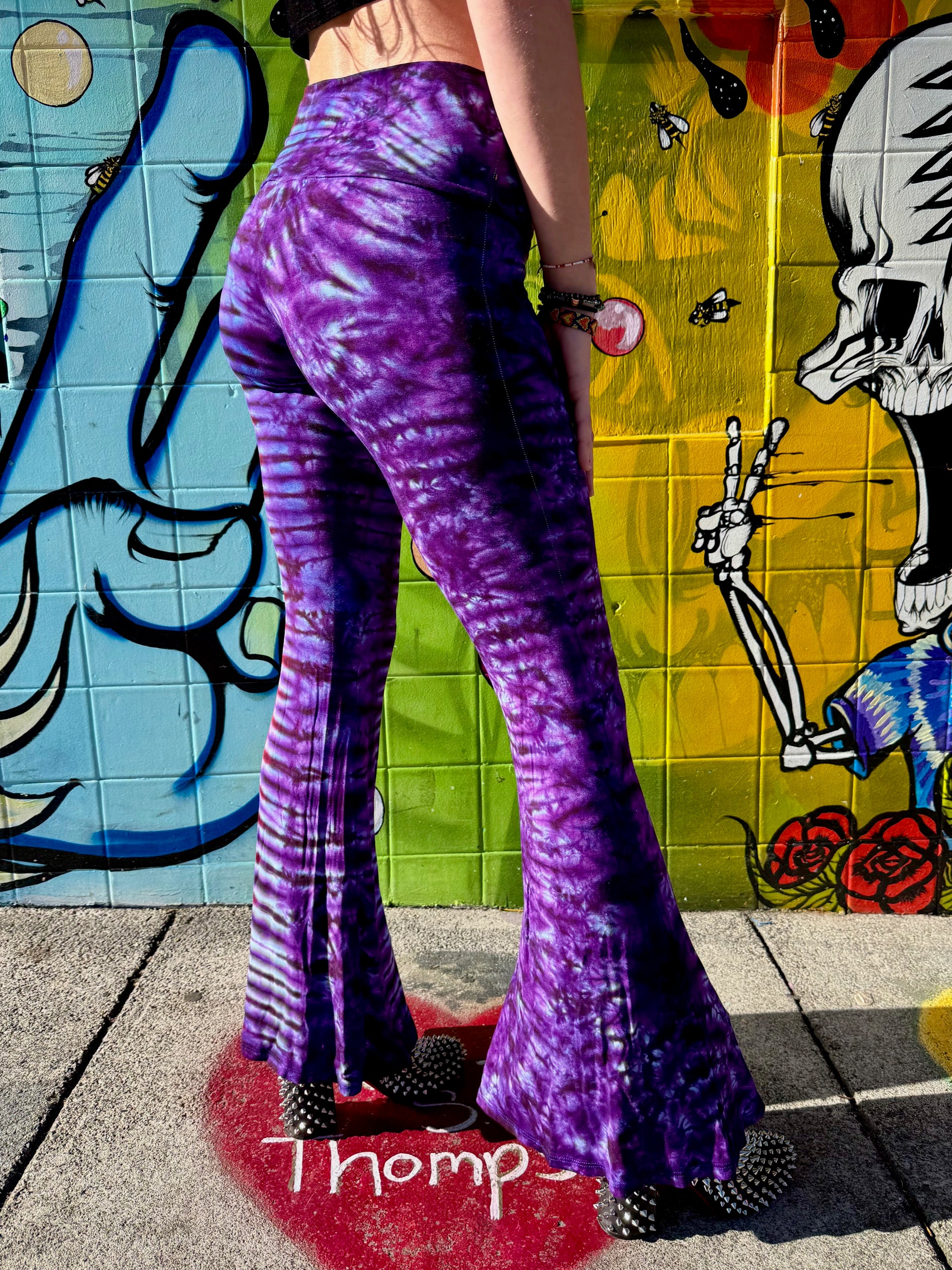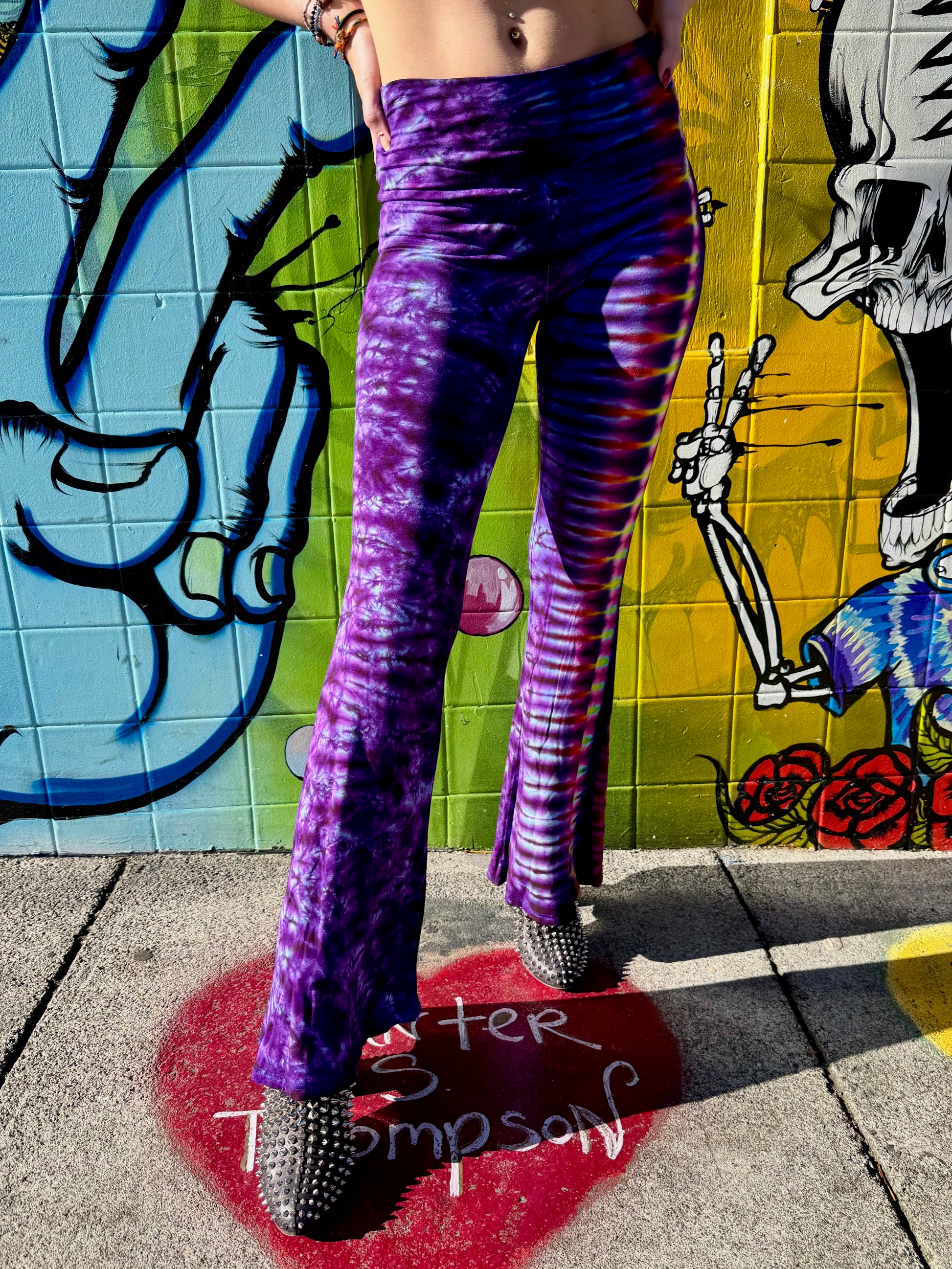These Pants have a slight Bell starting above the knee and a waist that can be high waisted or folded over.  The silhouette is long and sleek.