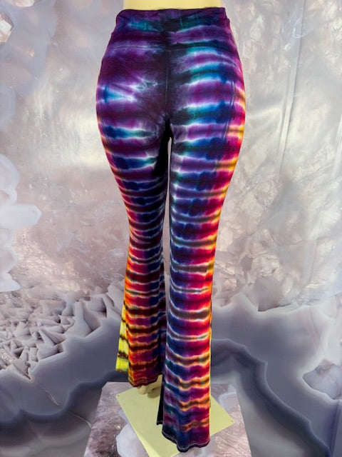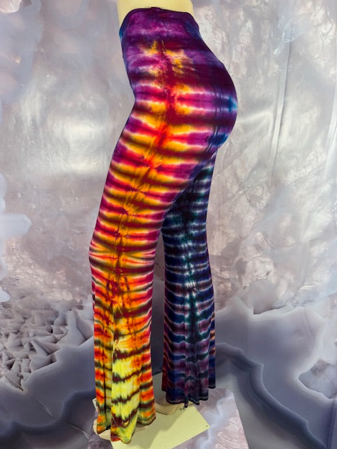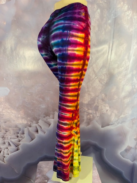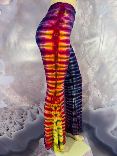 These Pants have a slight Bell starting above the knee and a waist that can be high waisted or folded over.  The silhouette is long and sleek.