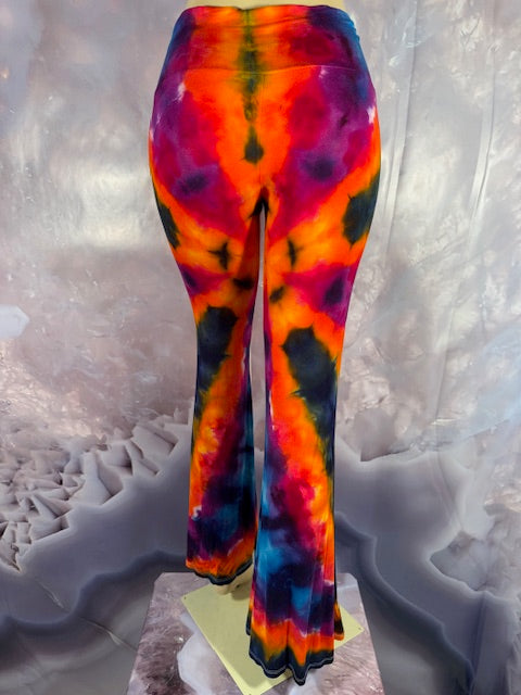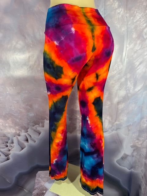 These Pants have a slight Bell starting above the knee and a waist that can be high waisted or folded over.  The silhouette is long and sleek.