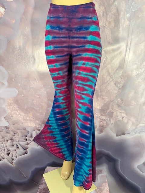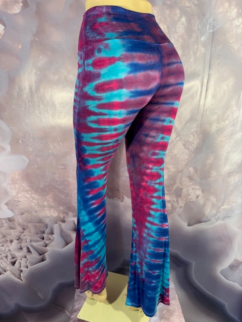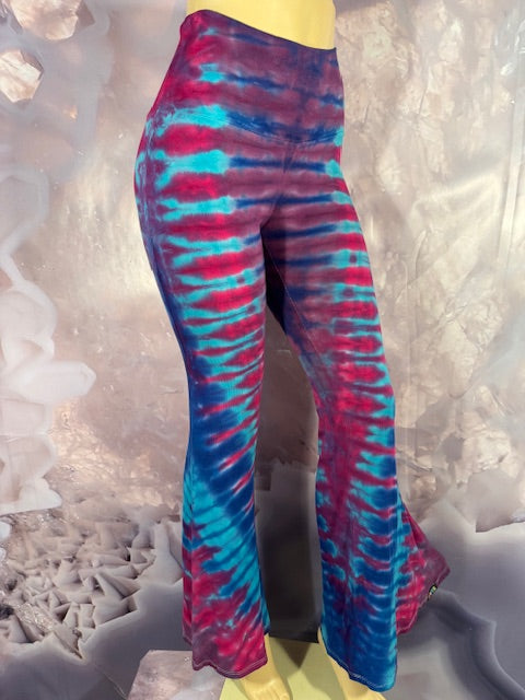 These Pants have a slight Bell starting above the knee and a waist that can be high waisted or folded over. The silhouette is long and sleek.