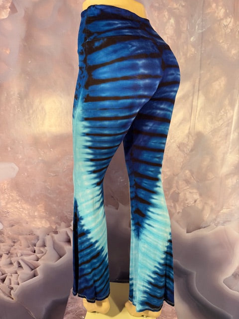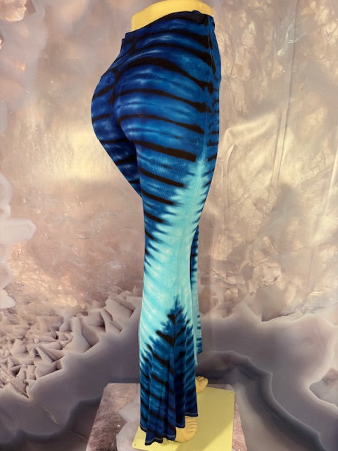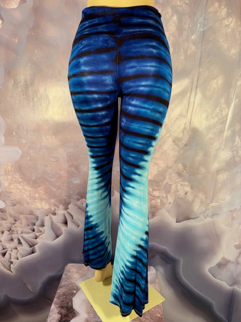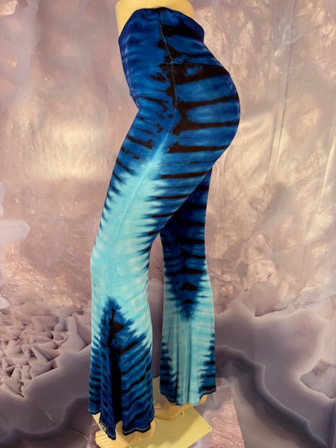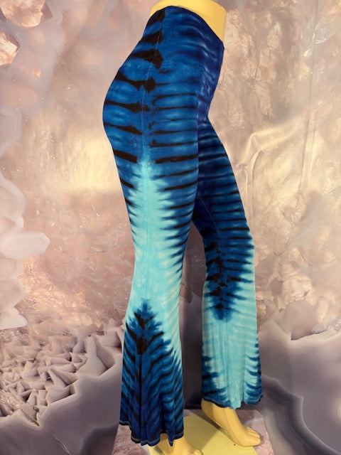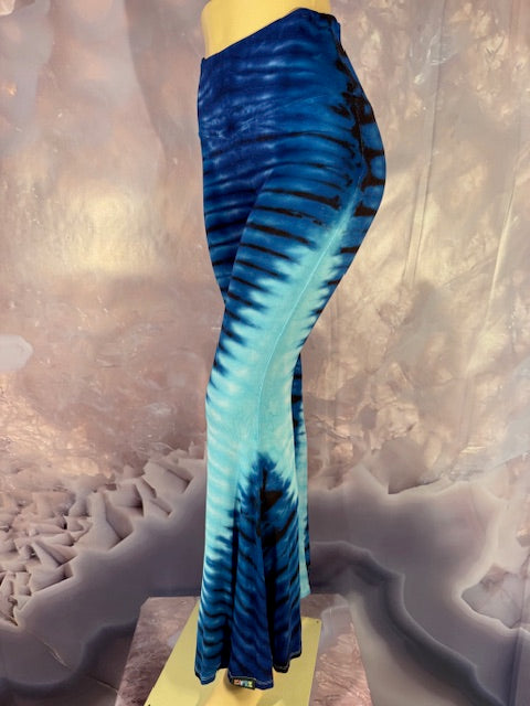 These Pants have a slight Bell starting above the knee and a waist that can be high waisted or folded over.  The silhouette is long and sleek.