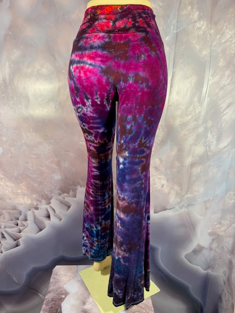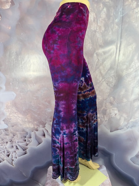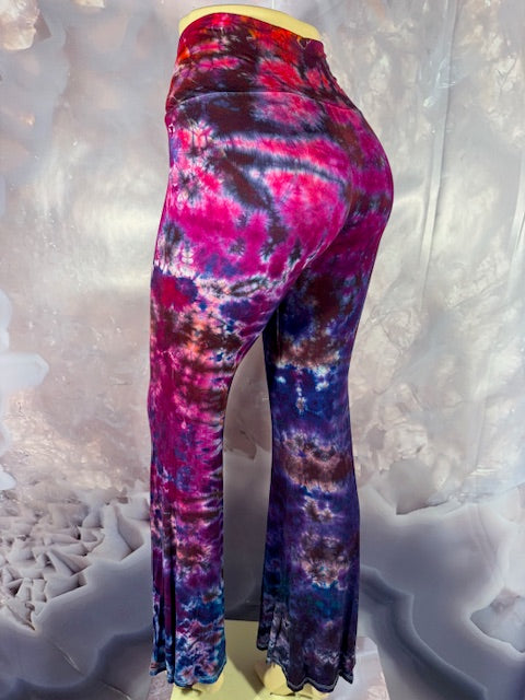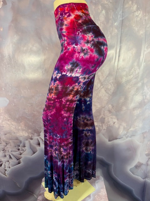 These Pants have a slight Bell starting above the knee and a waist that can be high waisted or folded over.  The silhouette is long and sleek.
