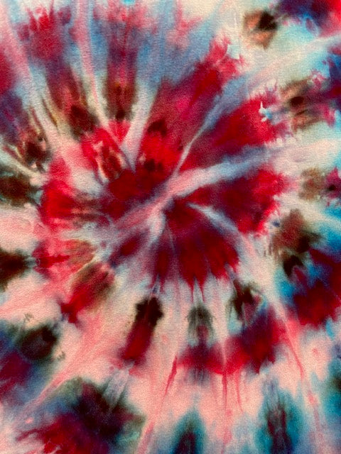 These are tiedyed by the AMAZING Ken Epp using the tie dye technique of HWI aka Water Irrigation which uses very hot water, powered dye & soda ash...all sprayed through a hose, hitting the dye at the same time. The dye needs NO time to set so there is no movement in the dye, it simply stays where it is sprayed.