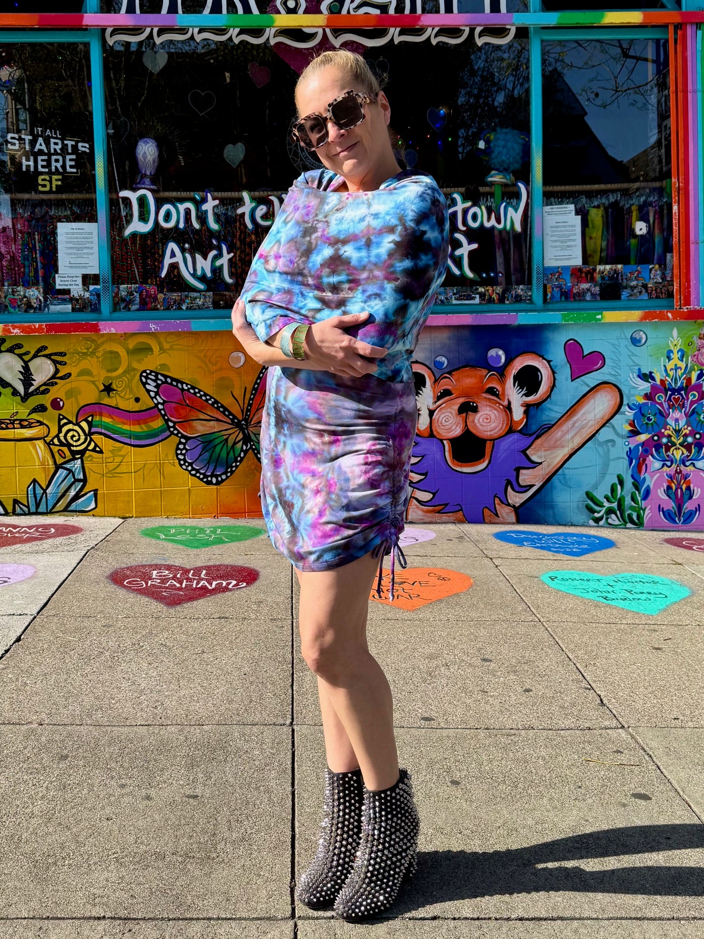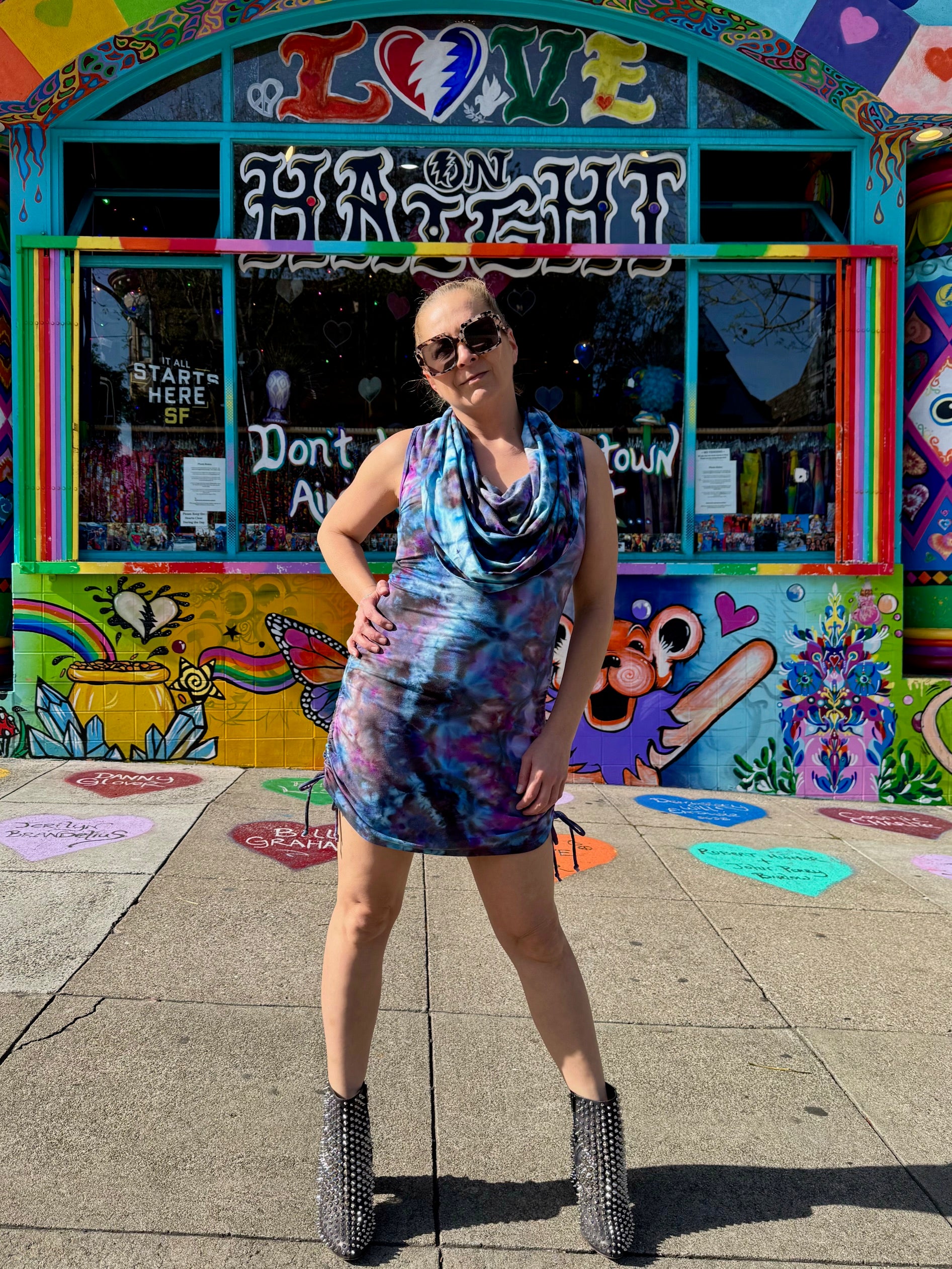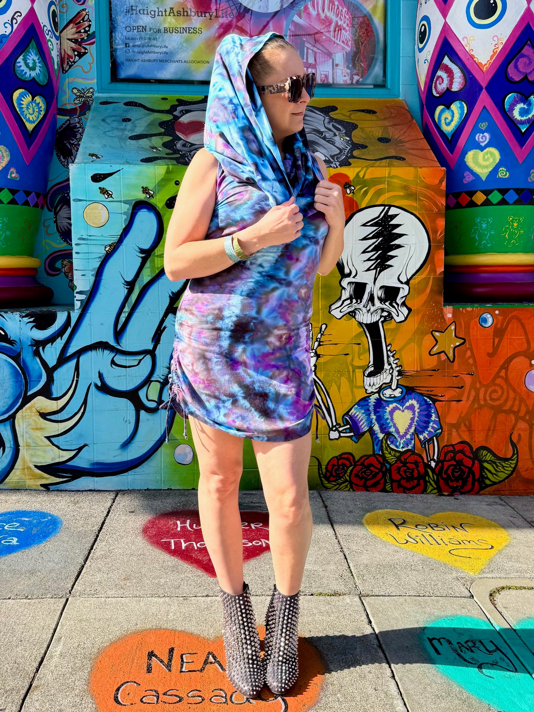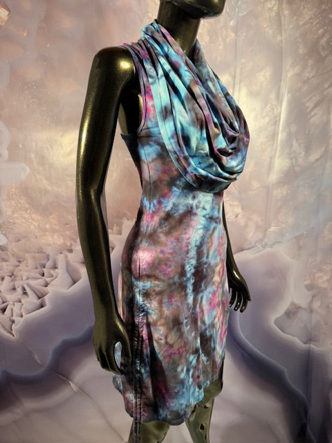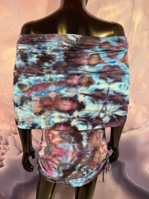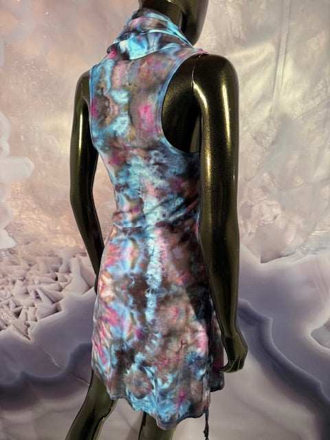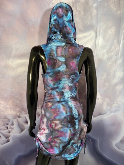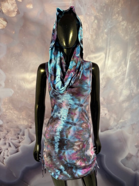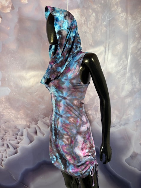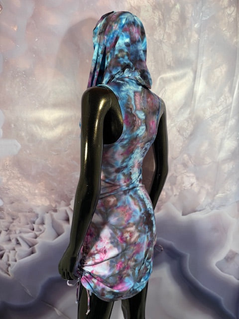 This dress may be worn as a Dress with a Cowl Neck, you can move that neck to a hood, or pull it over your shoulders to keep warm...WAIT...there is more, slip your arm out and have this epic one shoulder look or pop the other arm out and it is a tube top...AND you can pull up the strings in the skirt and bring it up, up, UP as short as you wanna go...even till that dress becomes a shirt.