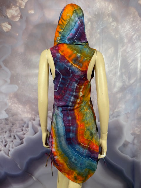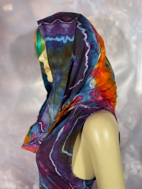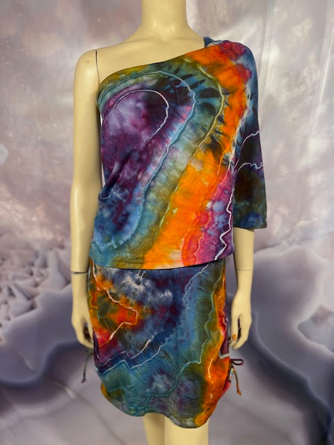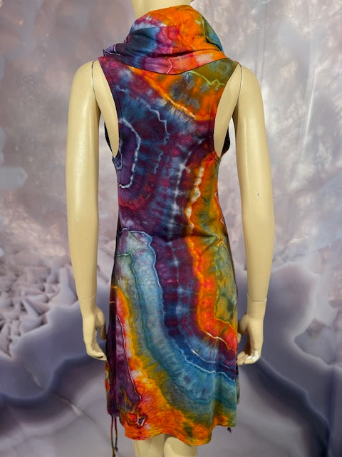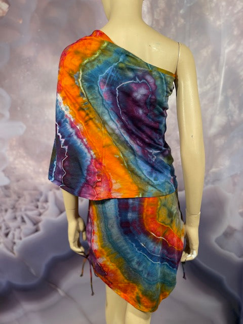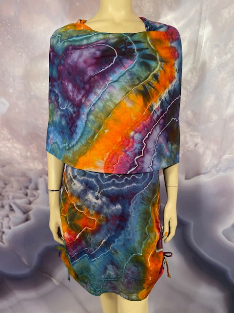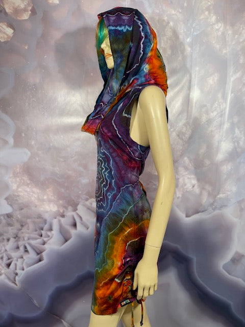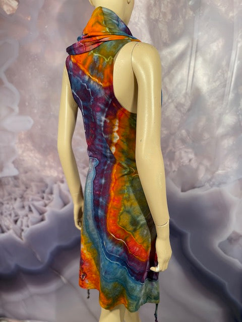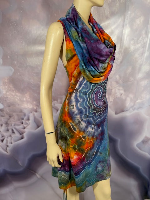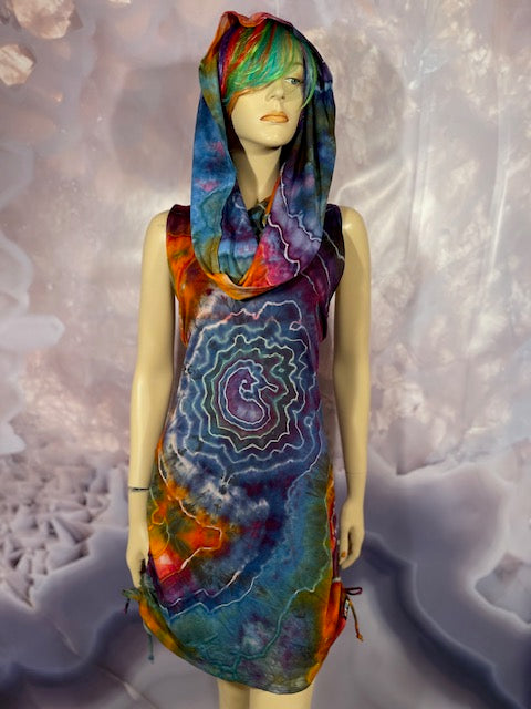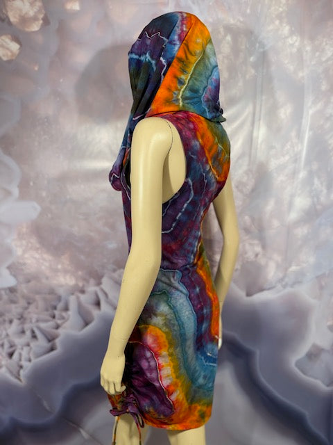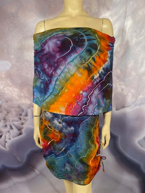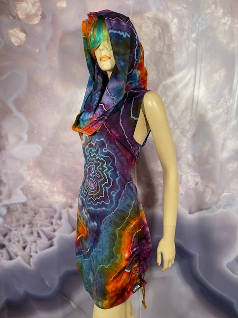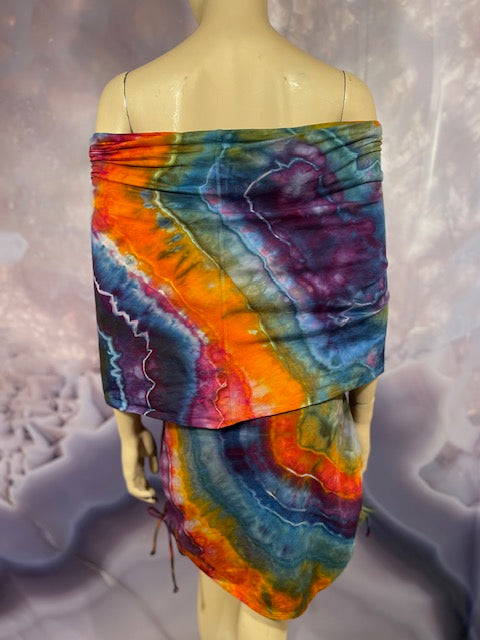This dress may be worn as a Dress with a Cowl Neck, you can move that neck to a hood, or pull it over your shoulders to keep warm...WAIT...there is more, slip your arm out and have this epic one shoulder look or pop the other arm out and it is a tube top...AND you can pull up the strings in the skirt and bring it up, up, UP as short as you wanna go...even till that dress becomes a shirt.