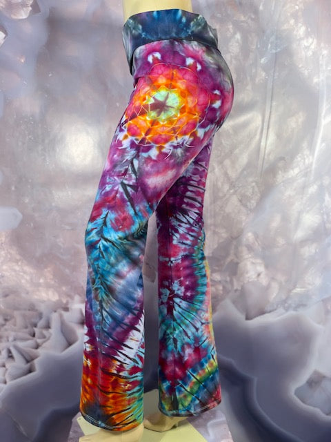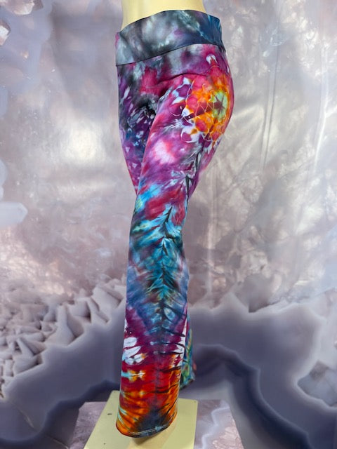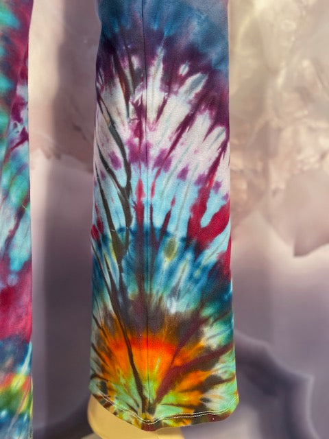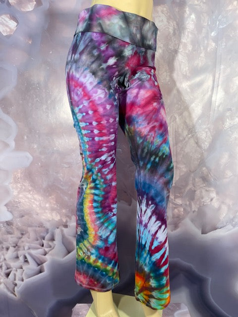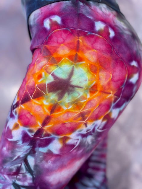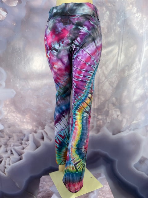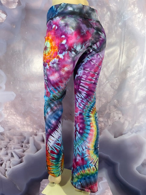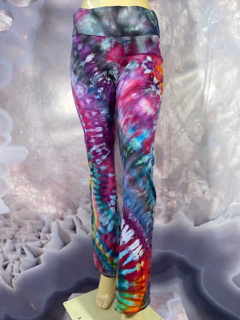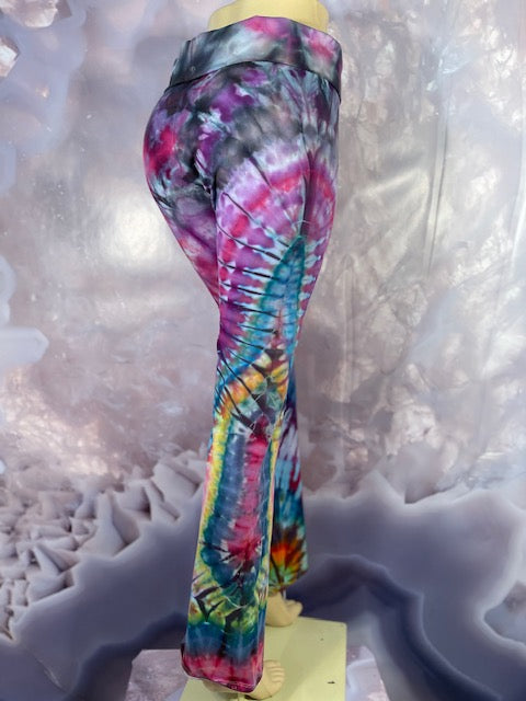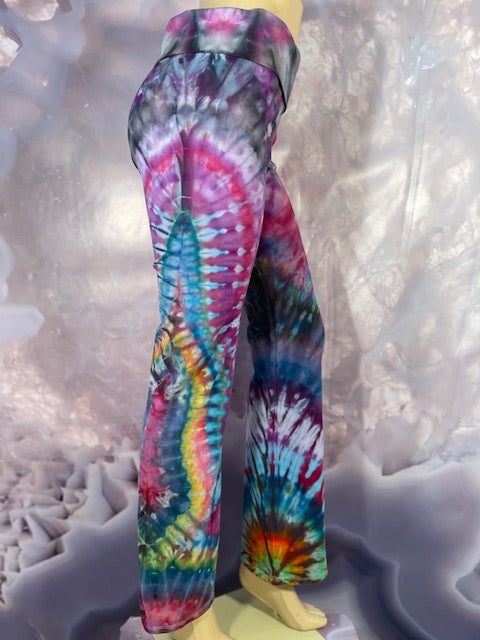 Royal Apparel branded USA made yoga pants with fold over waist.  Tiedyed by Brittany of Tyrannosaurus Dyes of Colorado.  We LOVE Brittany's tiedye!!!  We all go bananas every time we get a box from her in...JUST WOW!