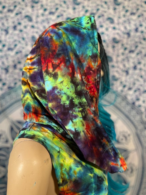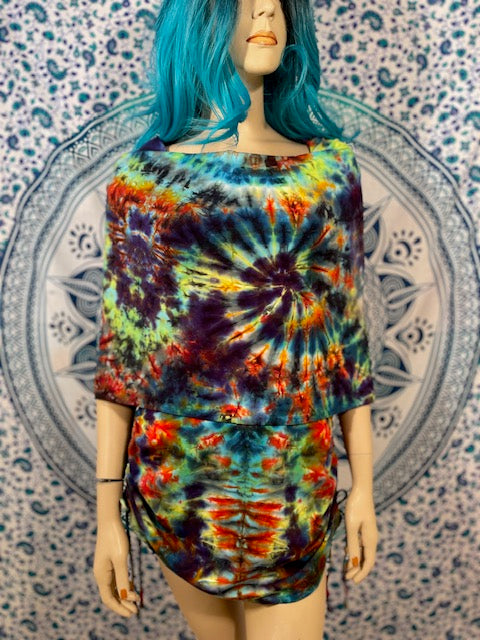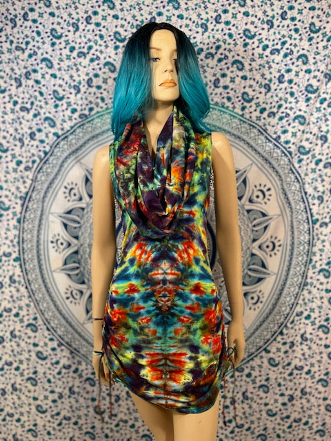 This dress may be worn as a Dress with a Cowl Neck, you can move that neck to a hood, or pull it over your shoulders to keep warm...WAIT...there is more, slip your arm out and have this epic one shoulder look or pop the other arm out and it is a tube top...AND you can pull up the strings in the skirt and bring it up, up, UP as short as you wanna go...even till that dress becomes a shirt.
