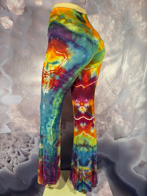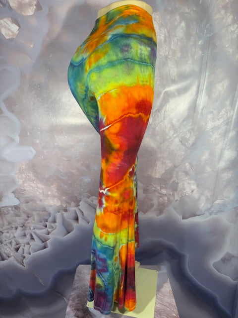These Pants have a slight Bell starting above the knee and a waist that can be high waisted or folded over.  The silhouette is long and sleek.