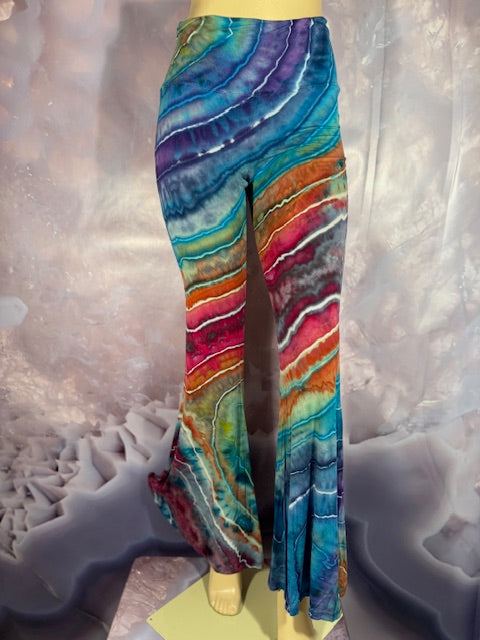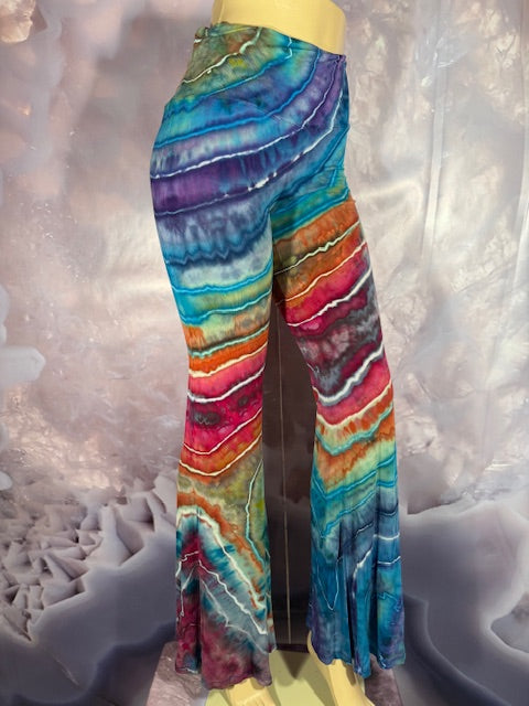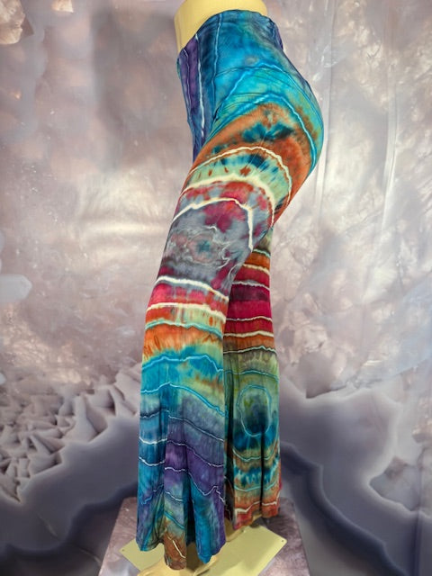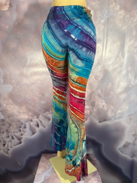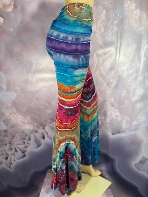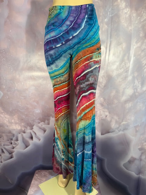These Pants have a slight Bell starting above the knee and a waist that can be high waisted or folded over. The silhouette is long and sleek.