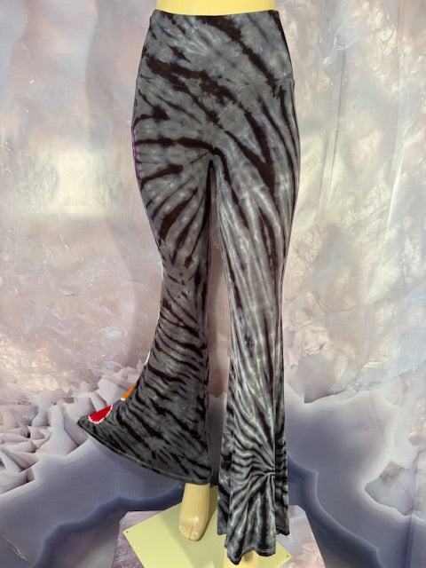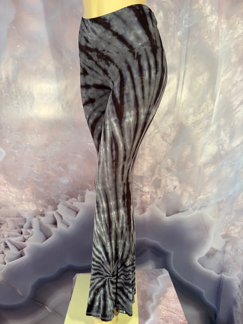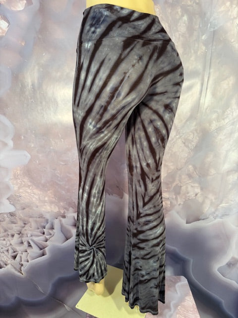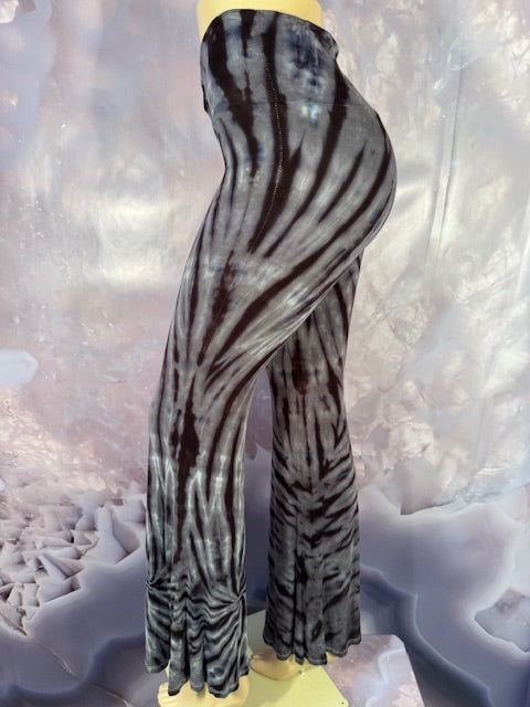 These Pants have a slight Bell starting above the knee and a waist that can be high waisted or folded over.  The silhouette is long and sleek.
