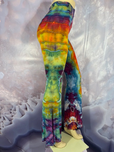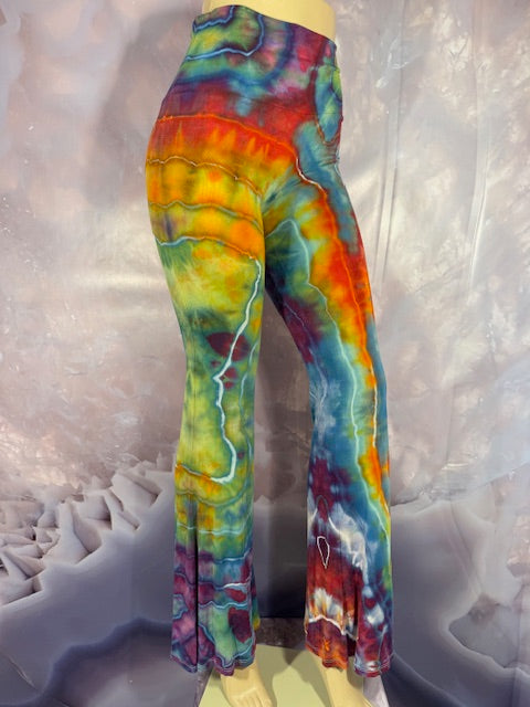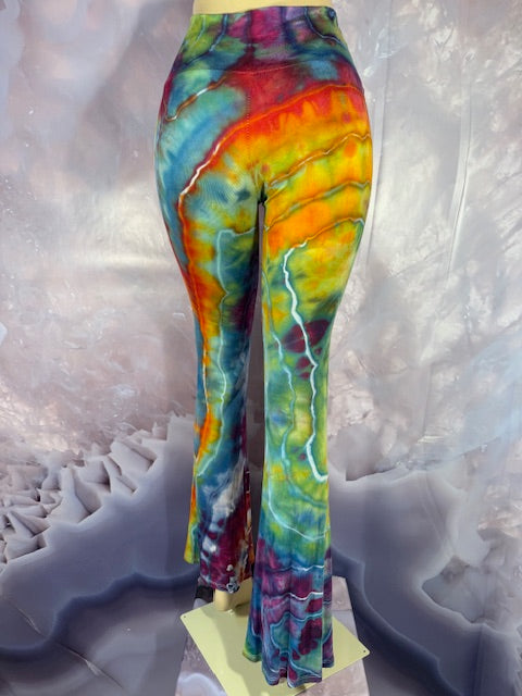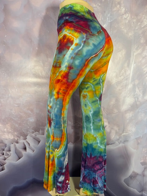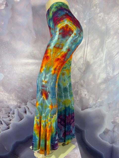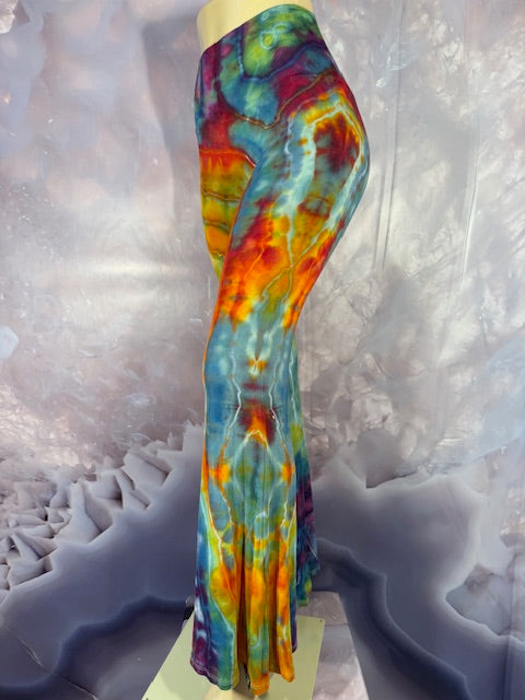 These Pants have a slight Bell starting above the knee and a waist that can be high waisted or folded over.  The silhouette is long and sleek.