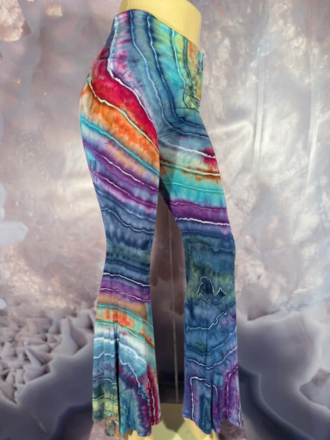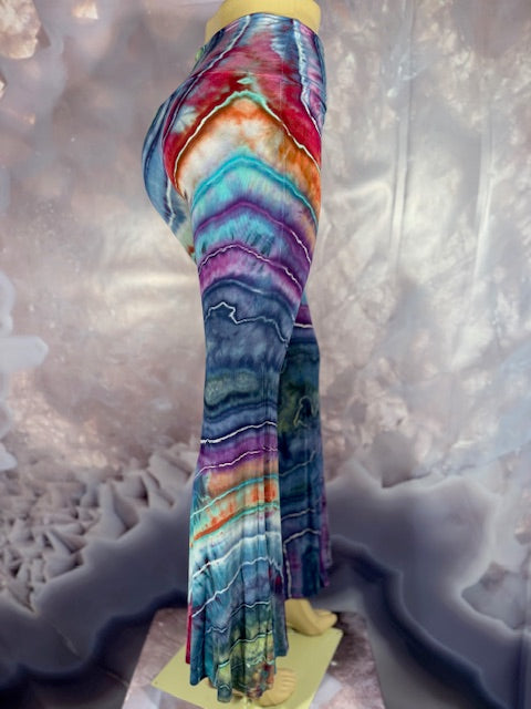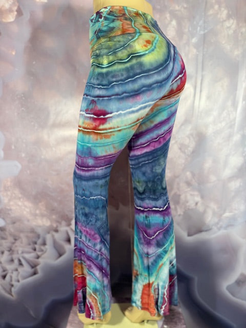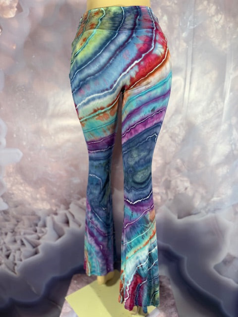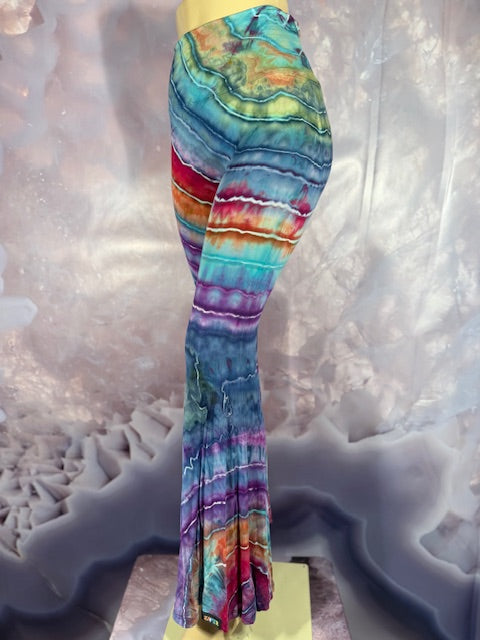 These Pants have a slight Bell starting above the knee and a waist that can be high waisted or folded over.  The silhouette is long and sleek.