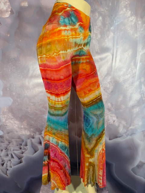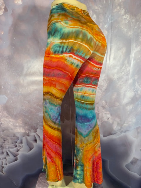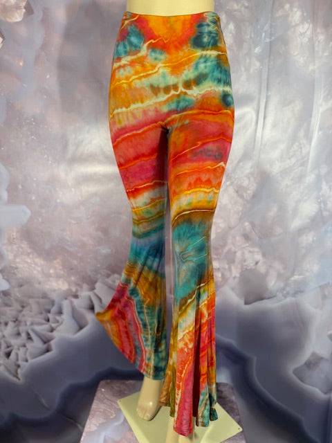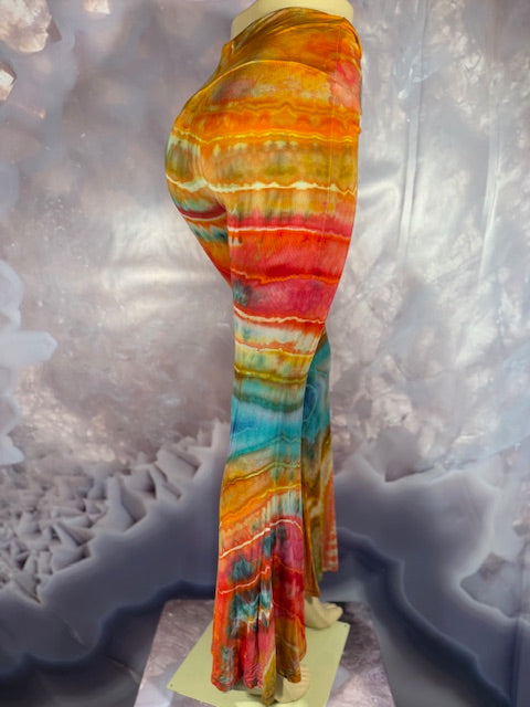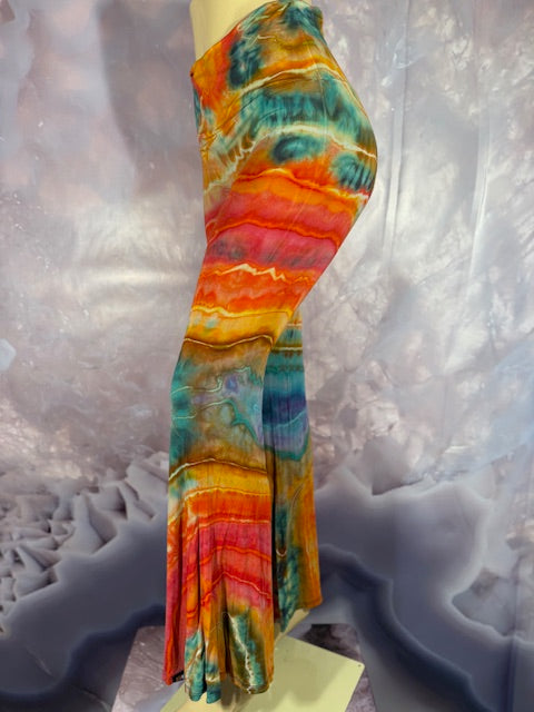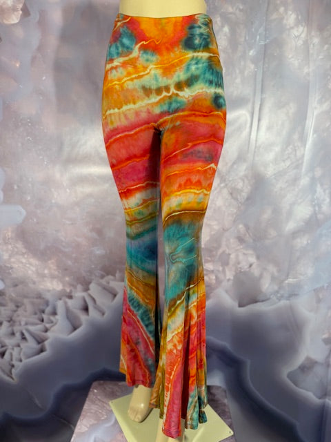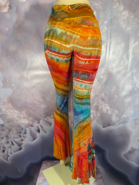 These Pants have a slight Bell starting above the knee and a waist that can be high waisted or folded over. The silhouette is long and sleek.