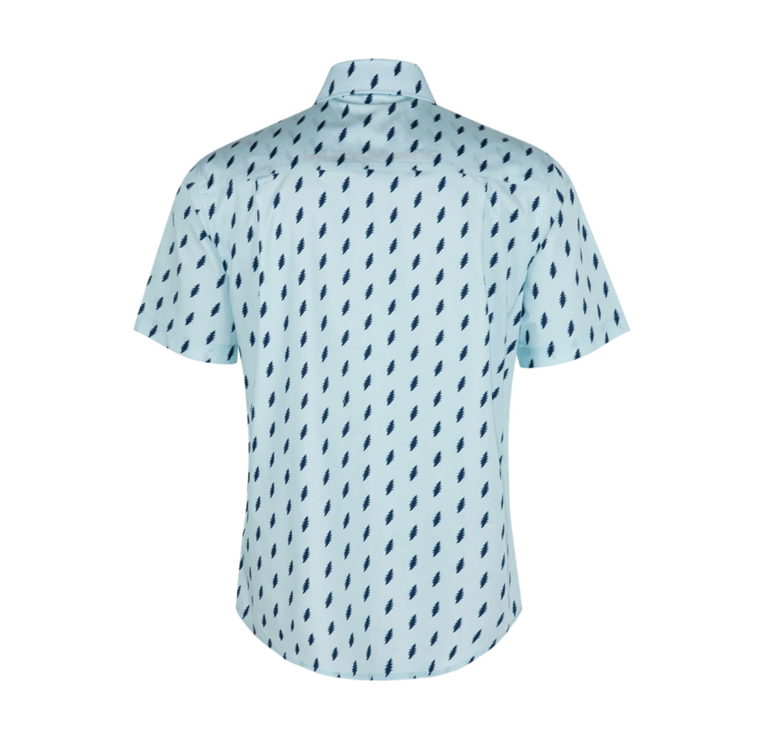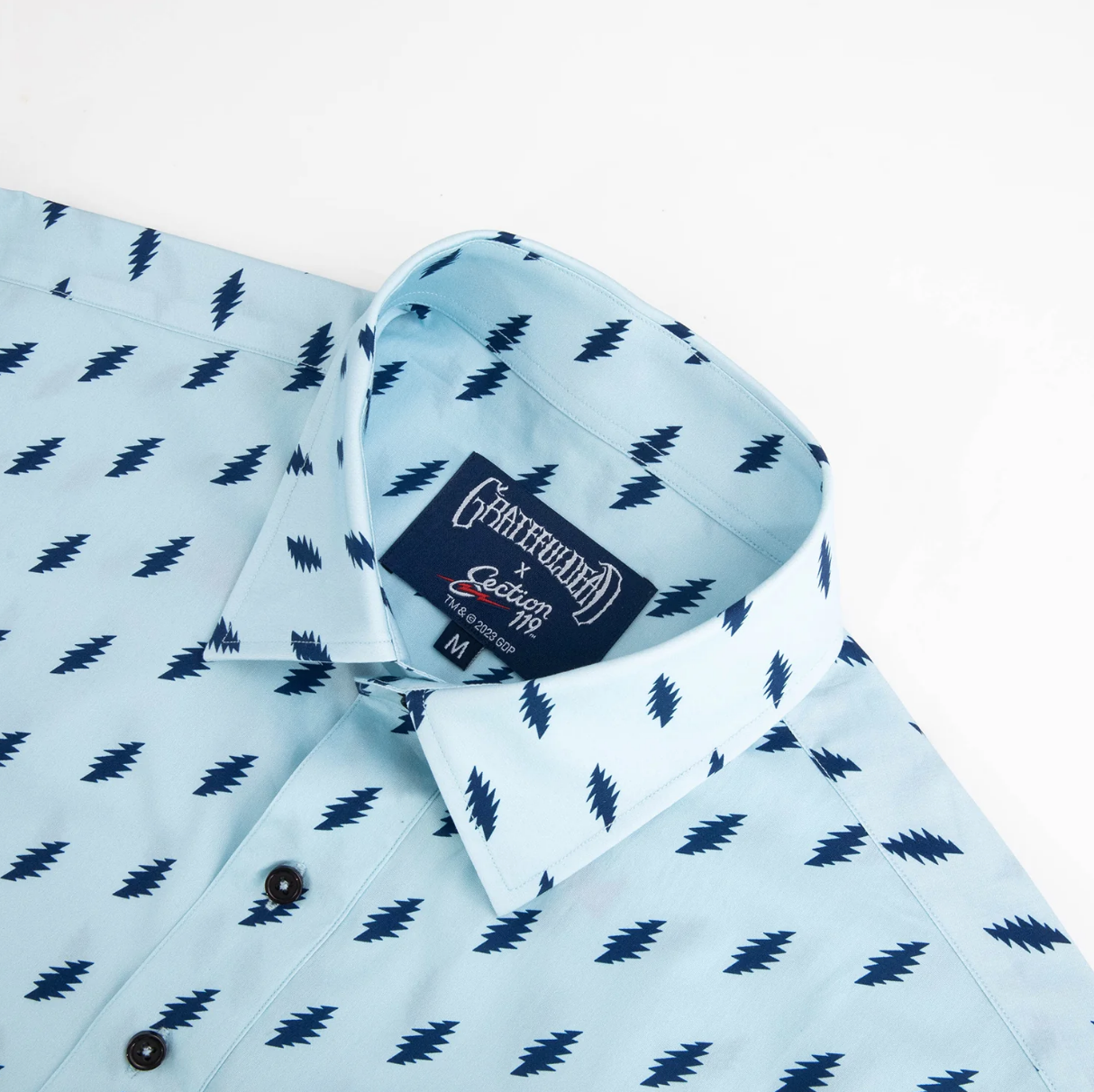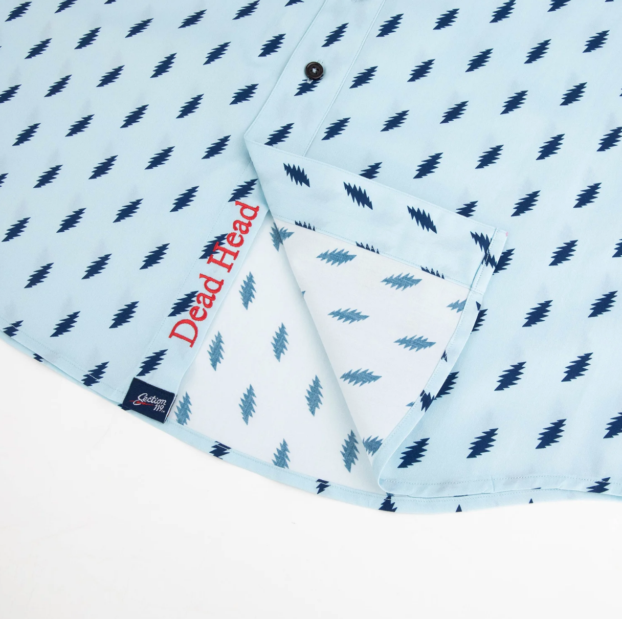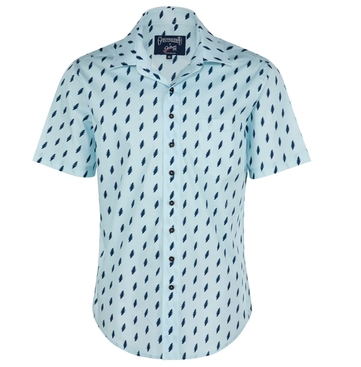 The Grateful Dead Classic Short Sleeve Button Down features a bolt pattern inspired by the iconic band. This shirt effortlessly blends comfort and timeless design. Perfect for any occasion, it's a must-have for Grateful Dead fans and fashion enthusiasts alike. Embrace the band's legendary legacy in a shirt that captures their eclectic spirit with a touch of unique style.