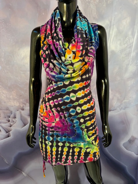 This dress may be worn as a Dress with a Cowl Neck, you can move that neck to a hood, or pull it over your shoulders to keep warm...WAIT...there is more, slip your arm out and have this epic one shoulder look or pop the other arm out and it is a tube top...AND you can pull up the strings in the skirt and bring it up, up, UP as short as you wanna go...even till that dress becomes a shirt.
