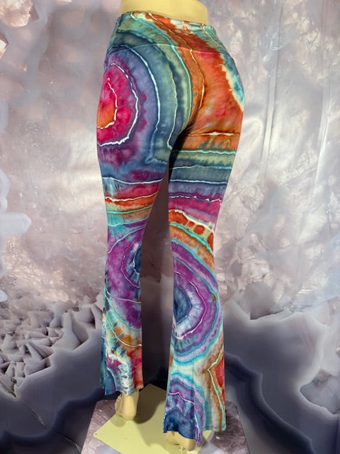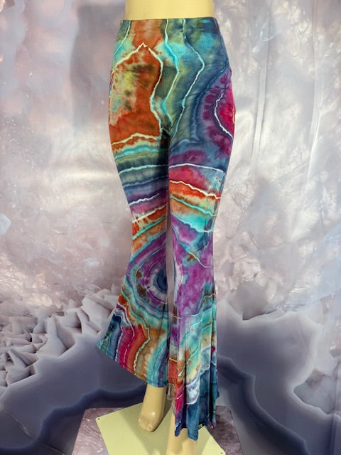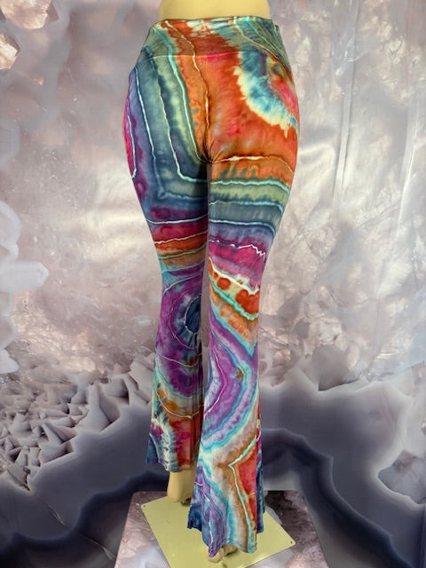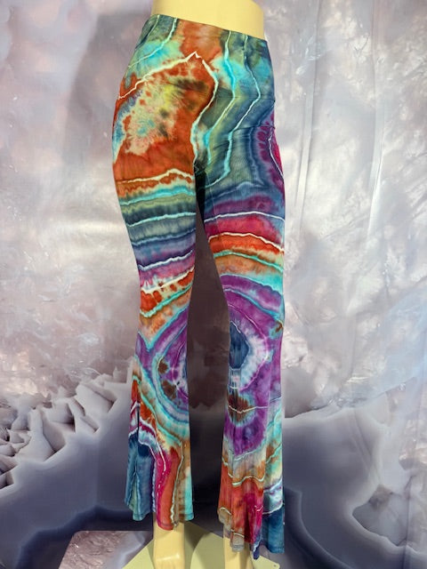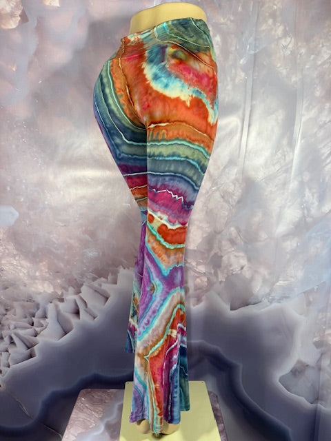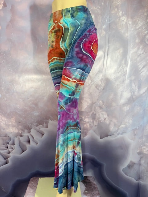 These Pants have a slight Bell starting above the knee and a waist that can be high waisted or folded over.  The silhouette is long and sleek.